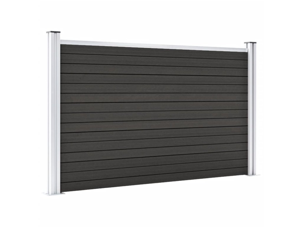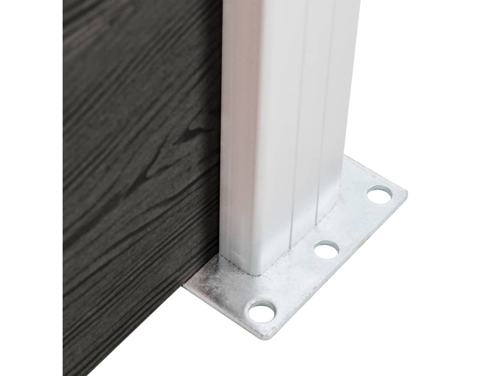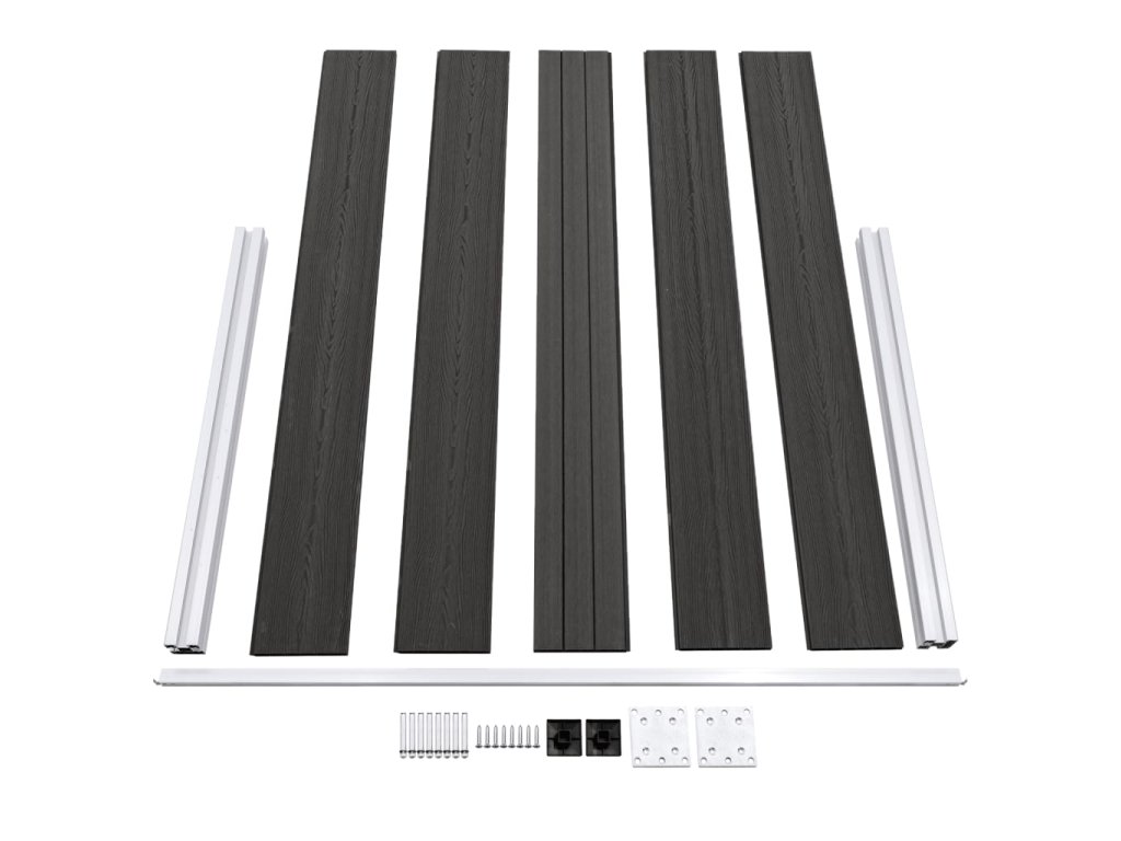 Balení obsahuje 9 dřevoplastových desek, 2 sloupky, 2 ocelové základny a 1 hliníkovou spojnici.