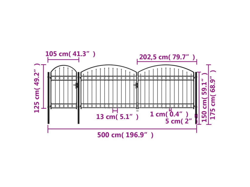 Elegantní zaoblený design naší brány je velmi atraktivní. Silné vodorovné výztuhy zpevňují rám, a zvyšují tak bezpečnost brány. Naše brána proto vytvoří nejen působivý vstup na váš pozemek, ale také spolehlivou bariéru. Je vyrobená z oceli a ošetřená práškovým lakem, který ji chrání před rzí a korozí. Zahradní brána je rovněž vybavená zámkem. Dodáváme ji spolu se třemi robustními sloupky s pevnými závěsy pro snadnou instalaci. Součástí dodávky je též zemní otočná zarážka, která umožňuje pro větší bezpečnost zajistit obě křídla brány na místě. Tato branka je skvělou kombinací stylu, pevnosti a stability!