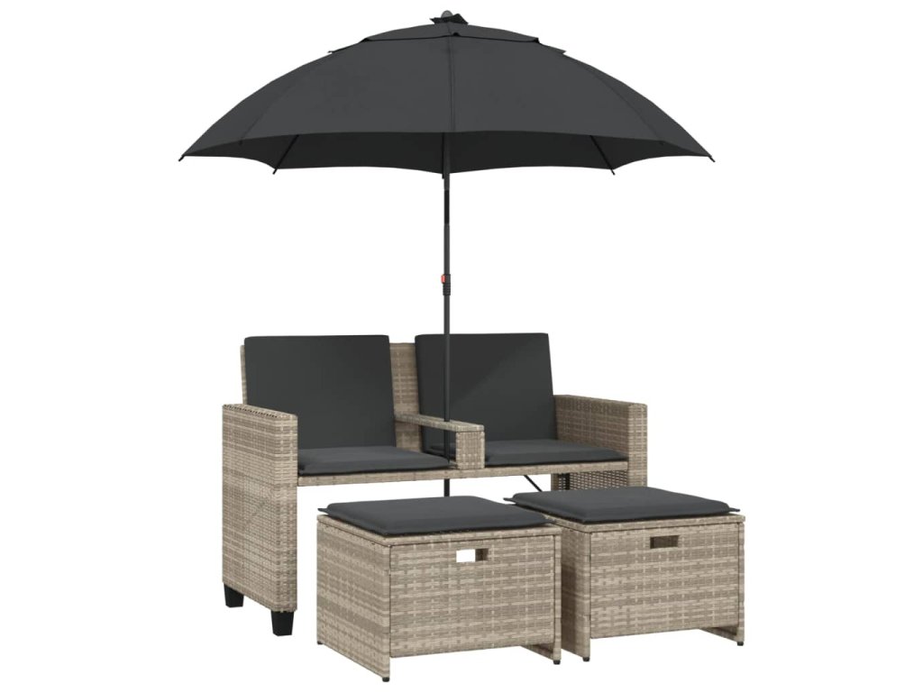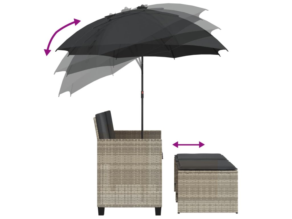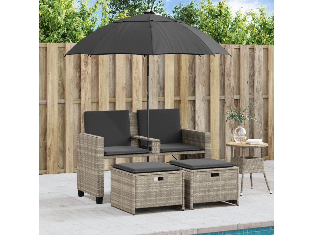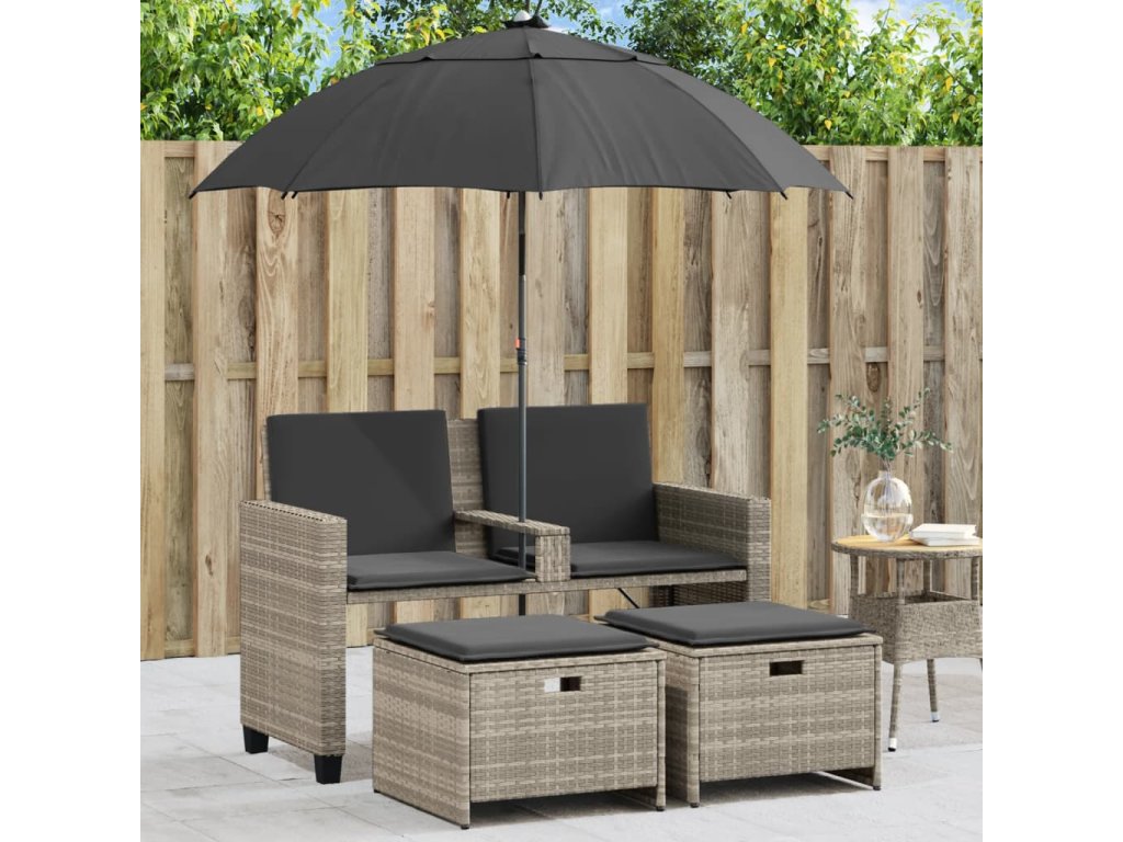 - Praktický slunečník: Zahradní pohovka je vybavena slunečníkem s naklápěcím mechanismem, který umožňuje snadné nastavení stříšky pro optimální zastínění a ochranu před sluncem.