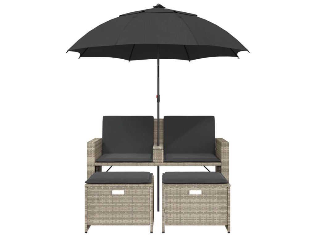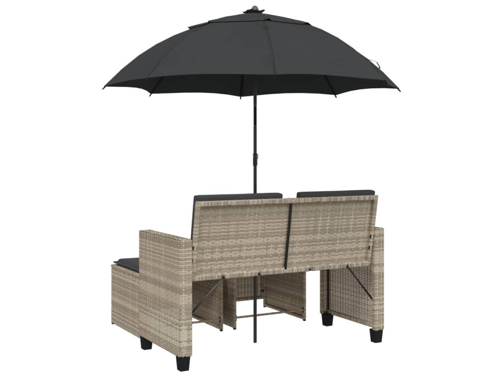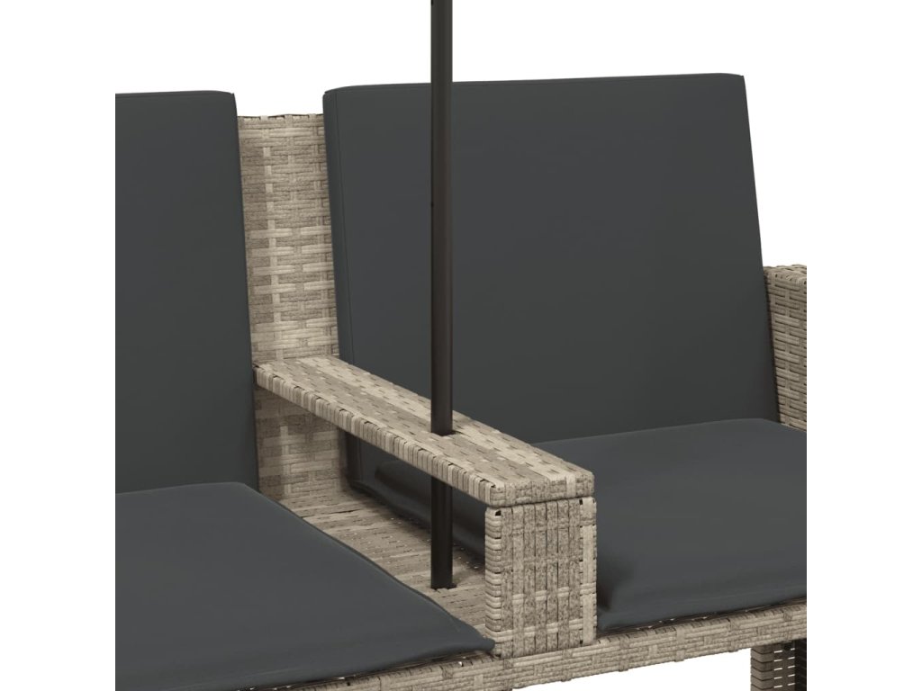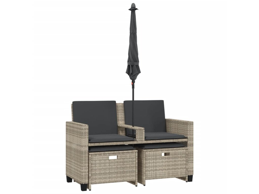 - Praktický slunečník: Zahradní pohovka je vybavena slunečníkem s naklápěcím mechanismem, který umožňuje snadné nastavení stříšky pro optimální zastínění a ochranu před sluncem.