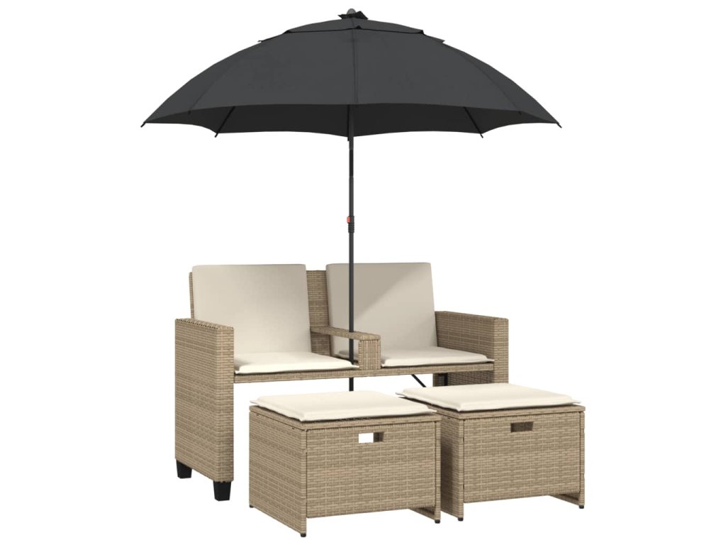 - Praktický slunečník: Zahradní pohovka je vybavena slunečníkem s naklápěcím mechanismem, který umožňuje snadné nastavení stříšky pro optimální zastínění a ochranu před sluncem.