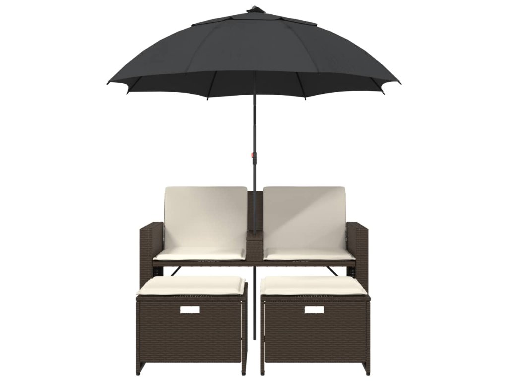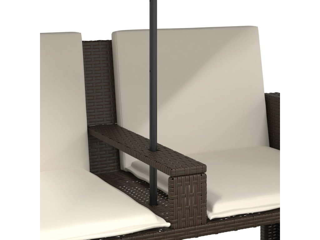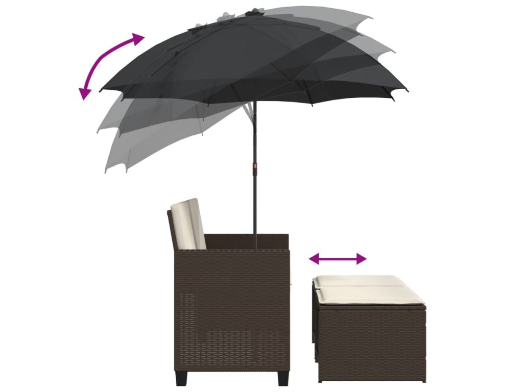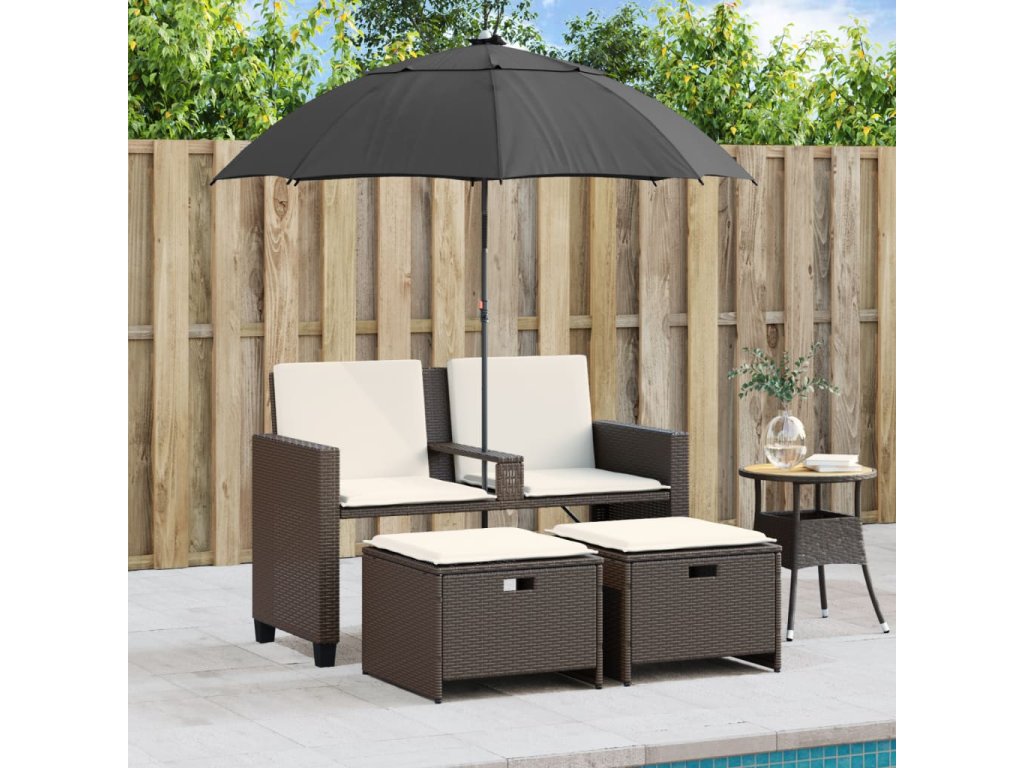 - Praktický slunečník: Zahradní pohovka je vybavena slunečníkem s naklápěcím mechanismem, který umožňuje snadné nastavení stříšky pro optimální zastínění a ochranu před sluncem.