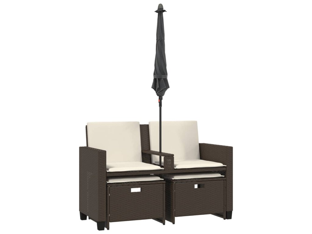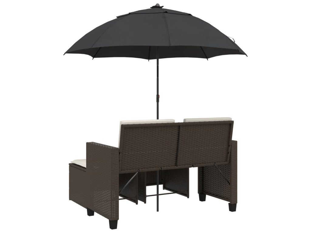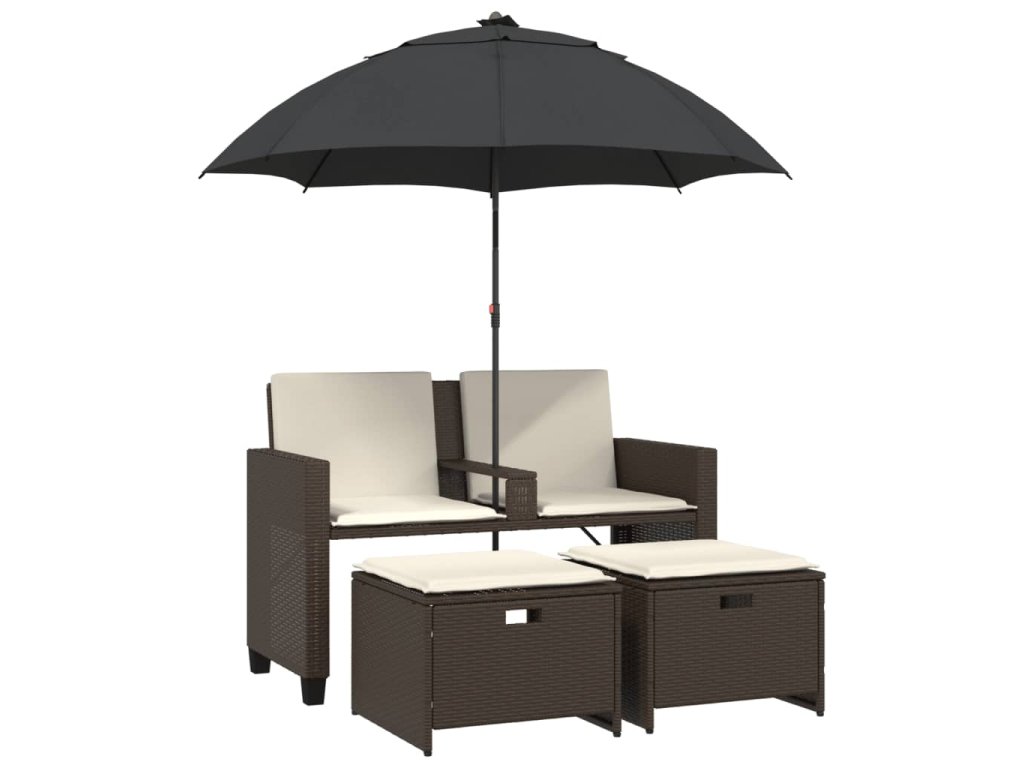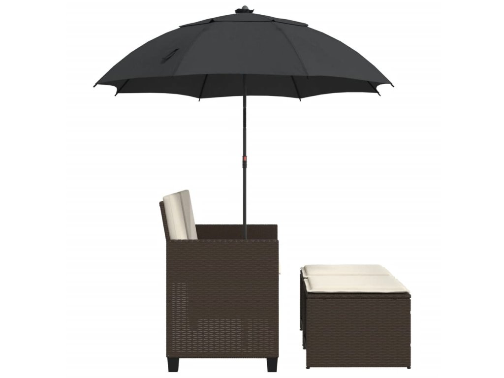 - Praktický slunečník: Zahradní pohovka je vybavena slunečníkem s naklápěcím mechanismem, který umožňuje snadné nastavení stříšky pro optimální zastínění a ochranu před sluncem.