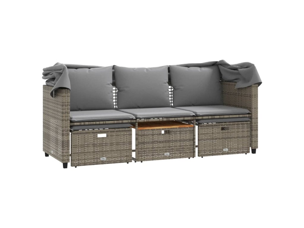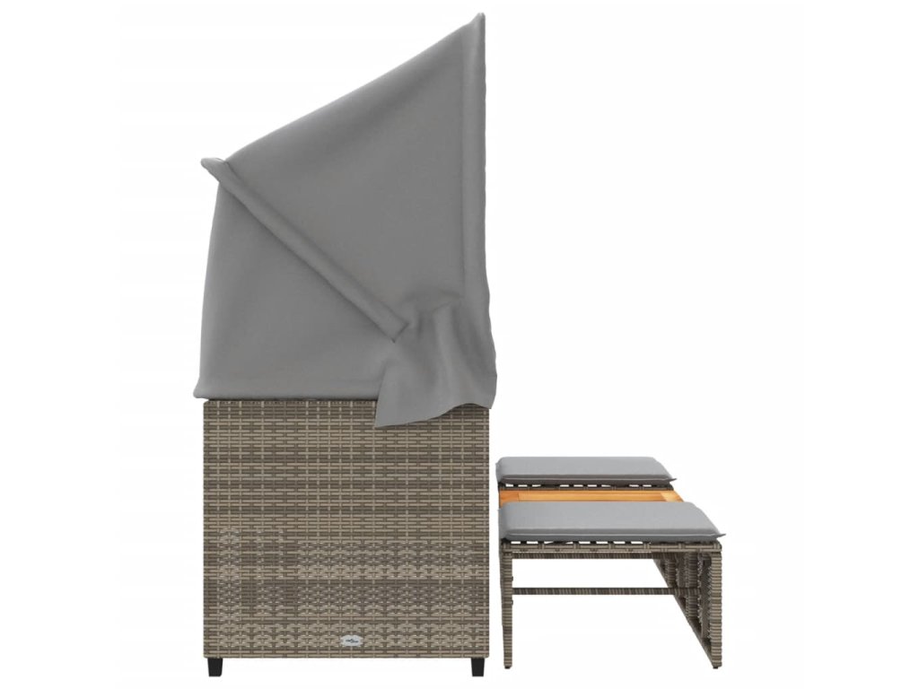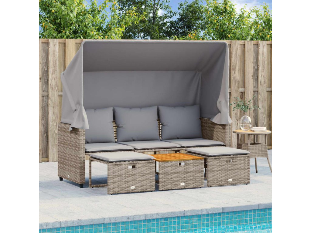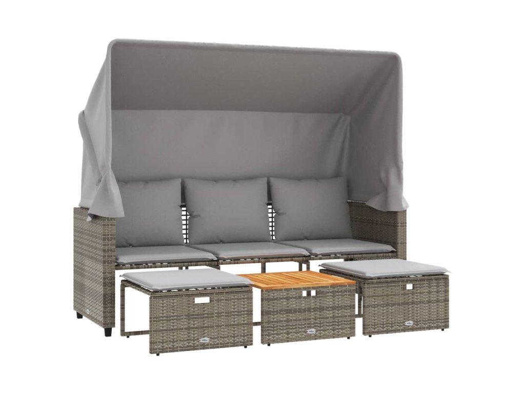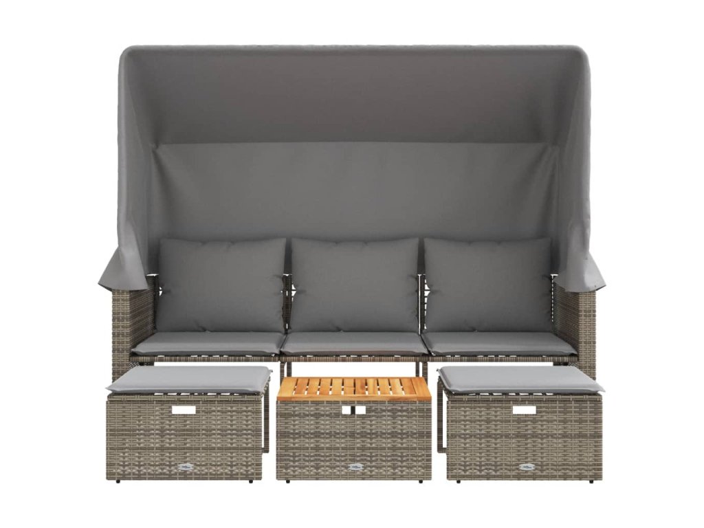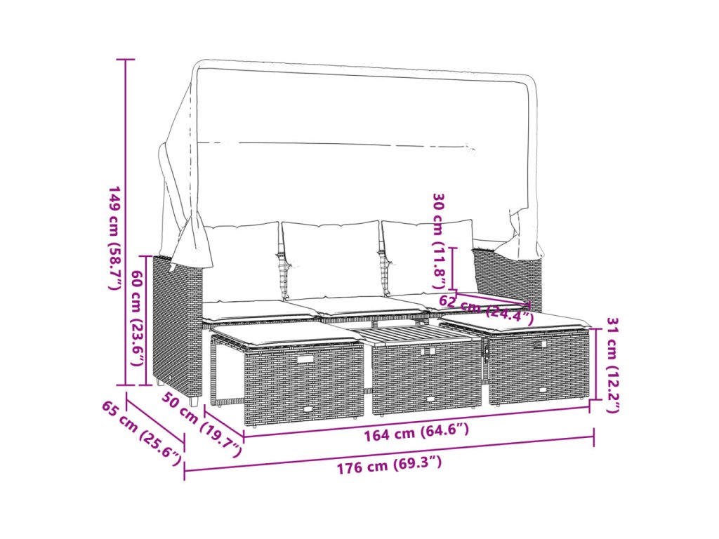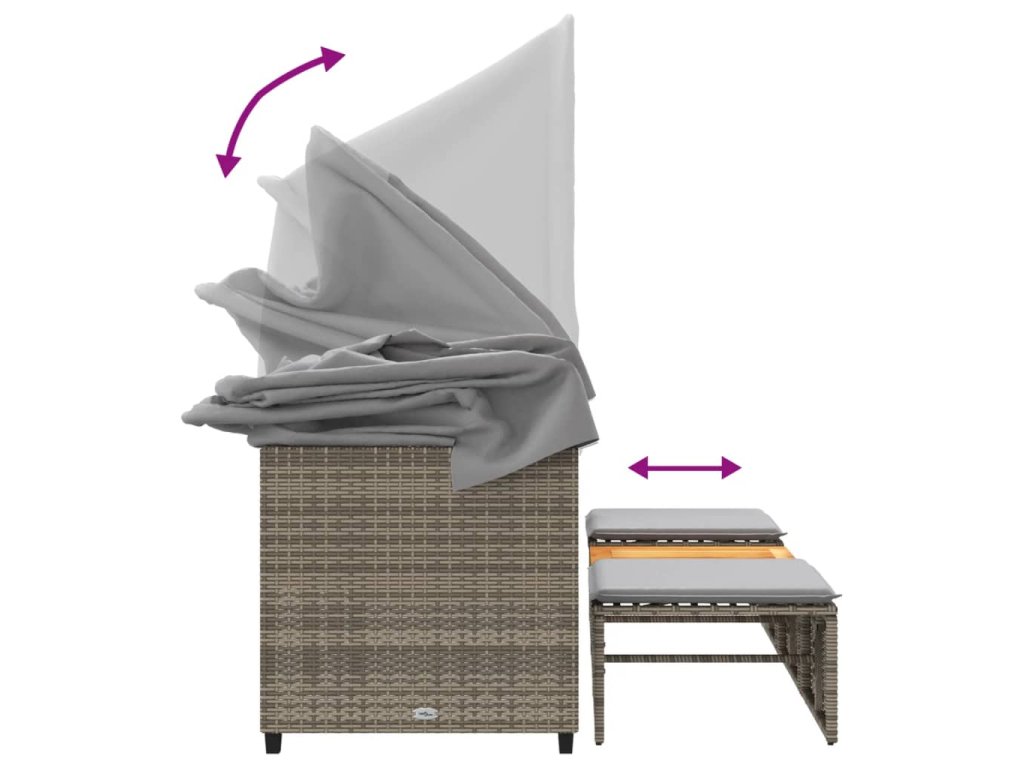 Tato zahradní pohovka se stříškou a taburety je dokonalým doplňkem vaší zahrady, terasy nebo dvorku a poskytne vám pohodlné a příjemné místo, kde si můžete povídat s rodinou a přáteli nebo jen tak odpočívat a užívat si pobyt venku.