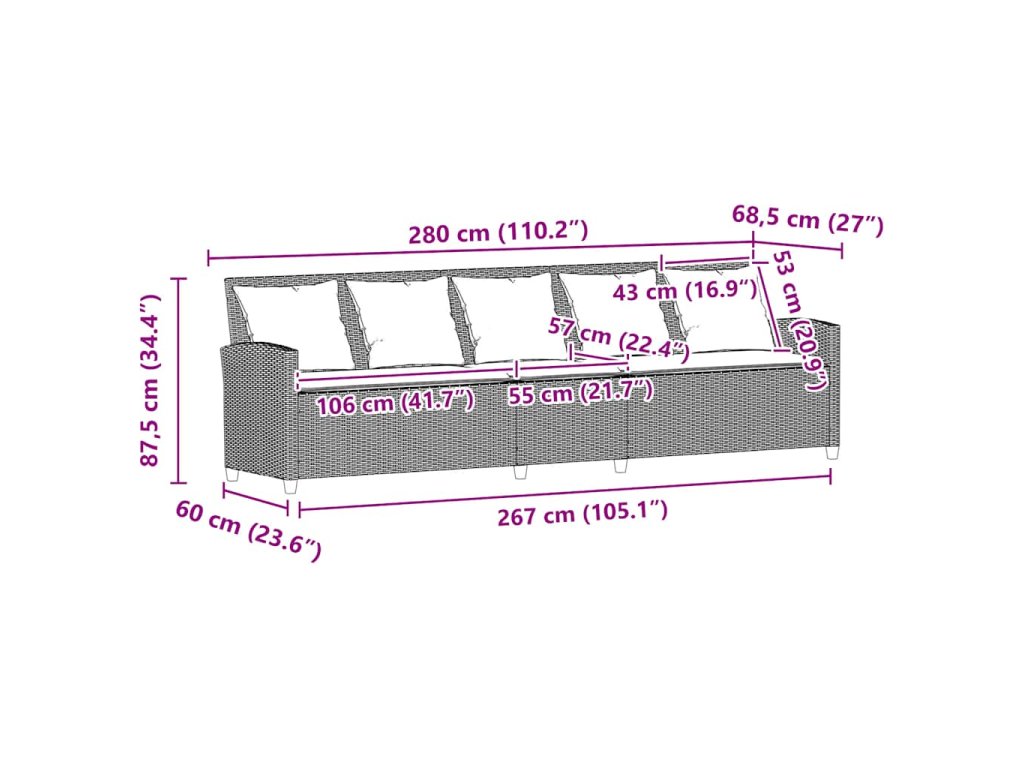 - Celkové rozměry: 280 x 68,5 x 87,5 cm (š x h x v)