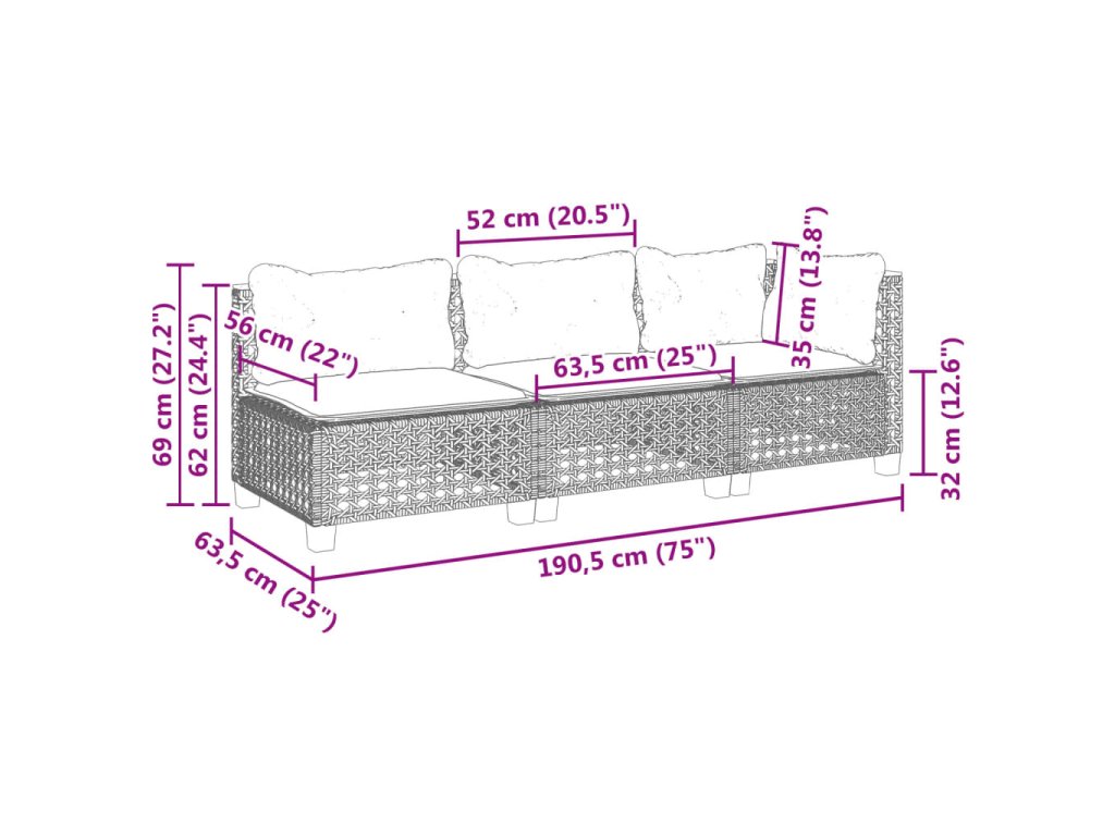 - Celkové rozměry pohovky: 190,5 x 63,5 x 62 cm (Š x H x V)