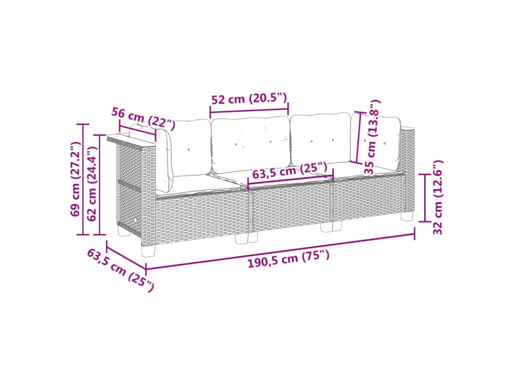 - Celkové rozměry pohovky: 190,5 x 63,5 x 62 cm (Š x H x V)