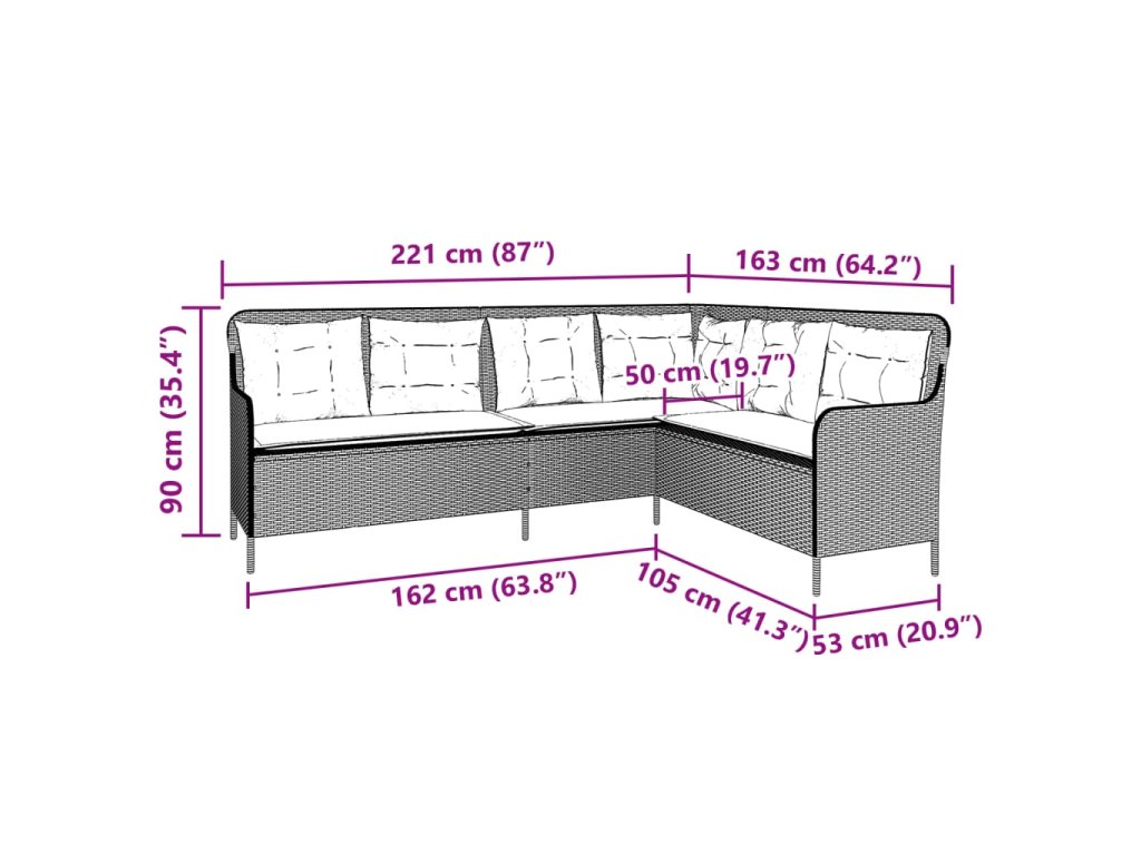 Tato zahradní pohovka ve tvaru písmene L je dokonalým doplňkem vaší zahrady, terasy nebo dvorku a poskytne vám pohodlné a příjemné místo, kde si můžete povídat s rodinou a přáteli nebo jen tak odpočívat a užívat si pobyt venku.