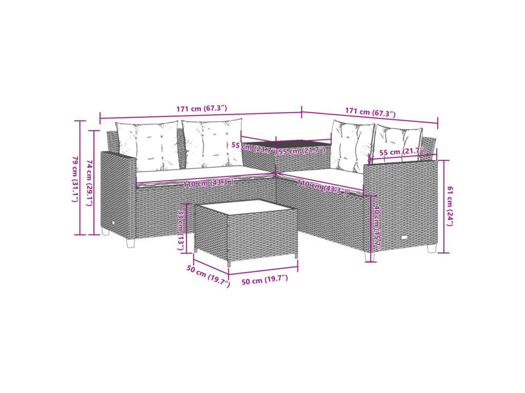 - Rozměry: 171 x 171 x 74 cm (Š x H x V)
