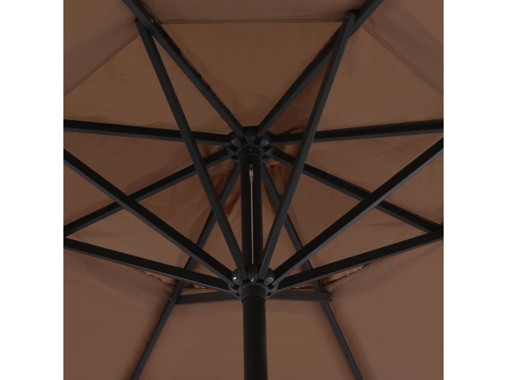 Stříška slunečníku je vyrobena z polyesterové tkaniny, která nepropouští škodlivé UV záření a nevybledne, a poskytne vám optimální ochranu před sluncem. Navíc se snadno čistí. Disponuje pevnou křížovou základnou pro větší stabilitu. Silná hliníková tyč s 8 odolnými žebry zajišťuje, že se slunečník nehýbe a hodně toho vydrží. Náš zahradní slunečník je vybaven klikovým mechanismem, což znamená, že se snadno otevírá i zavírá. Sestavení výrobku je jednoduché.