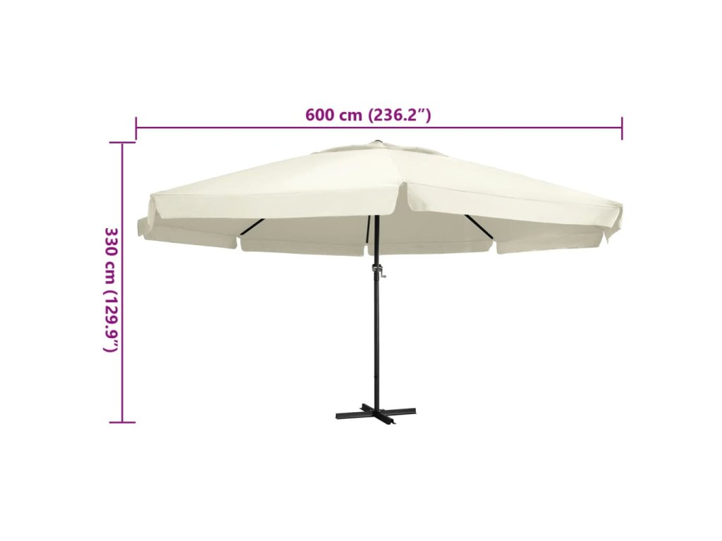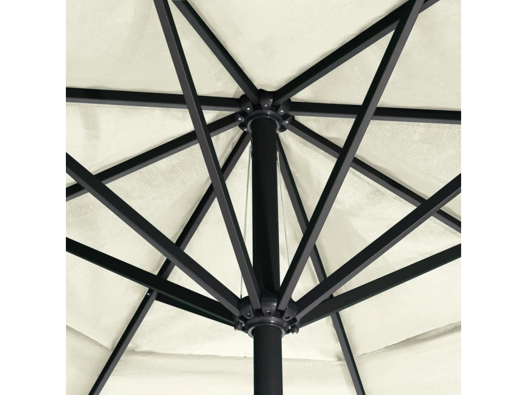 Stříška slunečníku je vyrobena z polyesterové tkaniny, která nepropouští škodlivé UV záření a nevybledne, a poskytne vám optimální ochranu před sluncem. Navíc se snadno čistí. Disponuje pevnou křížovou základnou pro větší stabilitu. Silná hliníková tyč s 8 odolnými žebry zajišťuje, že se slunečník nehýbe a hodně toho vydrží. Náš zahradní slunečník je vybaven klikovým mechanismem, což znamená, že se snadno otevírá i zavírá. Sestavení výrobku je jednoduché.