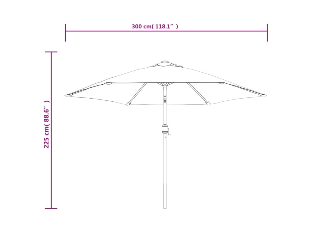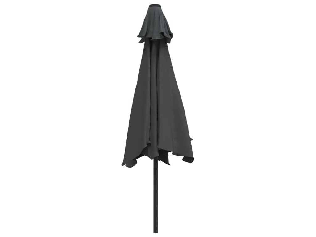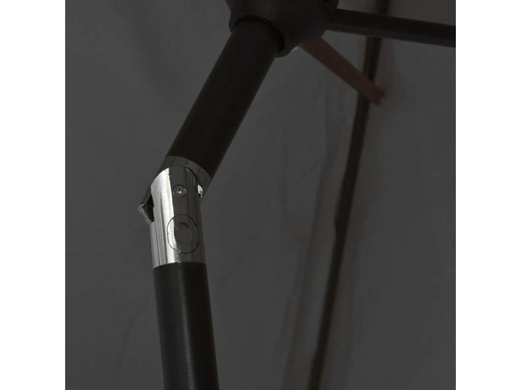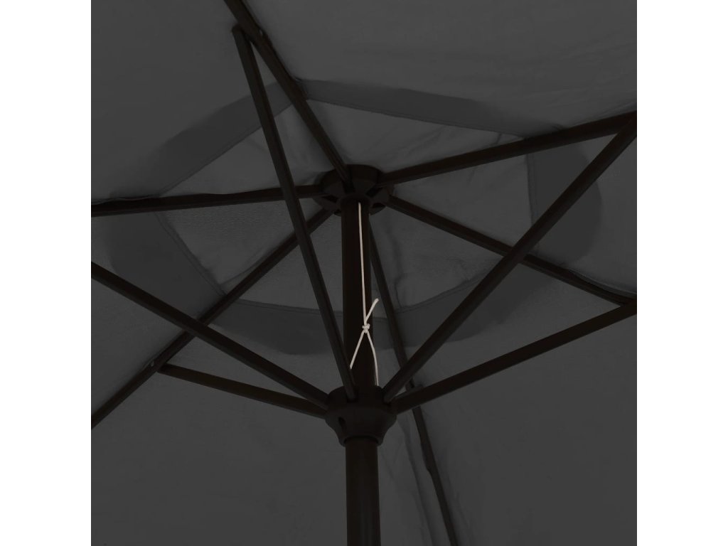 Stříška slunečníku je vyrobena z polyesterové tkaniny, která nepropouští škodlivé UV záření a nevybledne, a poskytne vám optimální ochranu před sluncem. Navíc se snadno čistí. Je vybavena 18 solárně napájenými LED světly, která po západu slunce automaticky osvětlí váš venkovní prostor a navodí v něm útulnou a romantickou atmosféru. Exkluzivní konstrukce tohoto slunečníku vám umožní naklonit ho tak, aby blokoval slunce, jak klesá za obzor. Silná ocelová tyč se 6 odolnými žebry zajišťuje, že se slunečník nehýbe a hodně toho vydrží. Náš zahradní slunečník disponuje klikovým mechanismem, což znamená, že se snadno otevírá i zavírá. Sestavení výrobku je snadné.