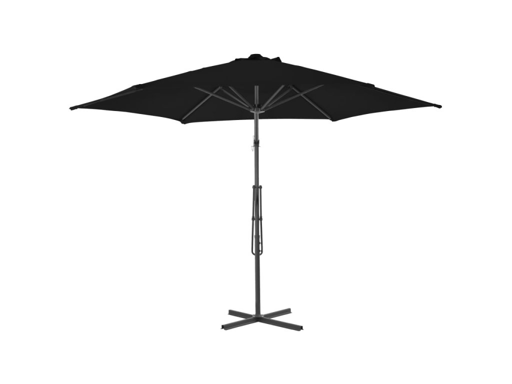 Stříška slunečníku je vyrobená z polyesterové tkaniny, která nepropouští škodlivé UV záření a nevybledne, a poskytne vám optimální ochranu před sluncem. Navíc se snadno čistí. Je vybavená pevnou křížovou základnou pro větší stabilitu. Silná ocelová tyč se 6 odolnými žebry zajišťuje, že se slunečník nehýbe a hodně toho vydrží. Tento jedinečný slunečník se dokáže otáčet o 360 stupňů, takže si úhel stříšky můžete jednoduše nastavit podle pohybů slunce.