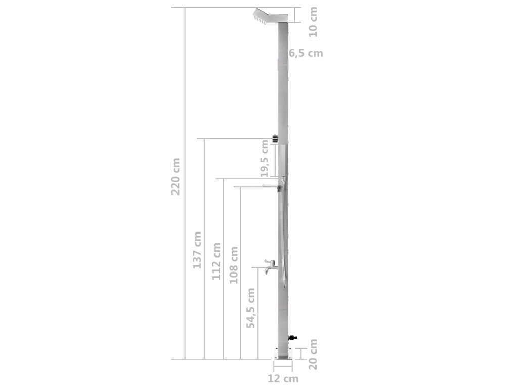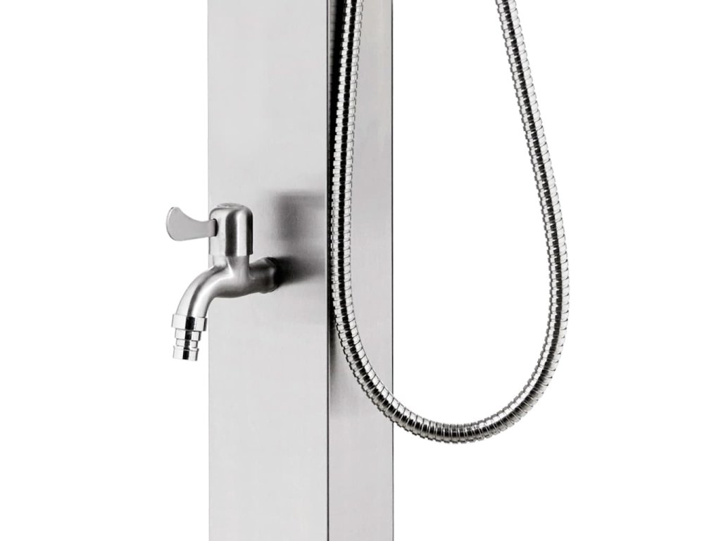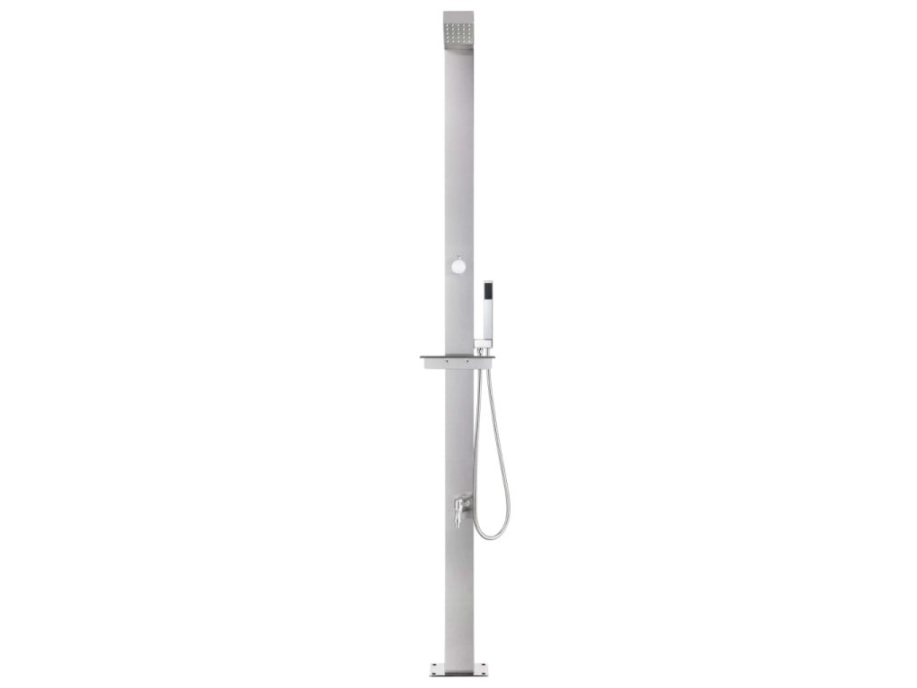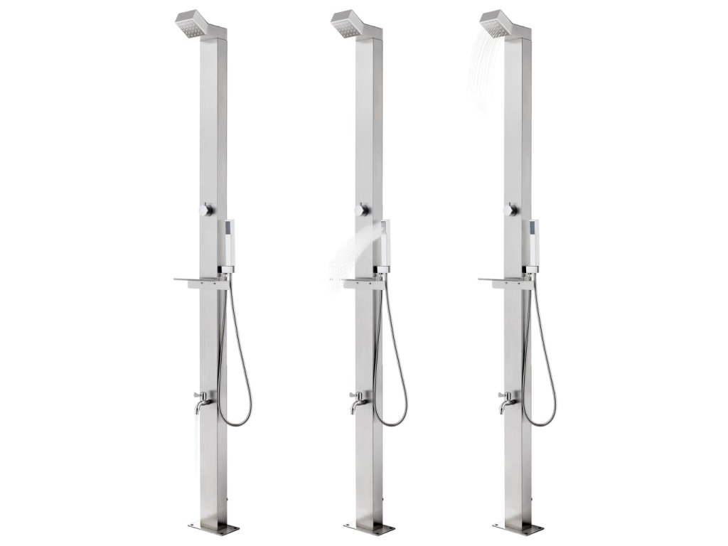 Tato venkovní sprcha je vyrobená z nerezové oceli, takže je klimaticky odolná. Sprchový systém má hlavovou sprchu, ruční sprchu a kohoutek pro mytí nohou, aby vám usnadnil práci na zahradě a umožnil zalévání a rychlé sprchování. Dvojitě zajištěná hadice je flexibilní a je navržená pro ruční sprchu. Je také vybavená plastovým držákem na ruční sprchu a poličkou pro snadné zavěšení zahradní hadice.