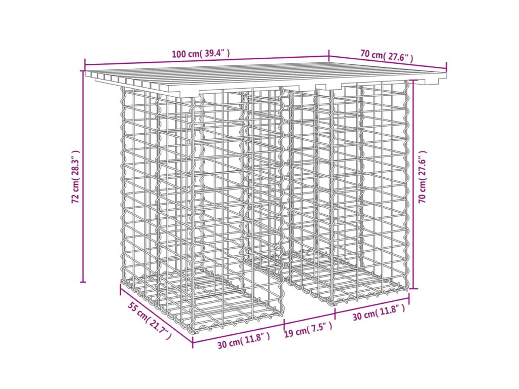 - Robustní a stabilní základna: Tato venkovní lavice je vybavena základnou z pozinkovaného ocelového gabionového koše, který je navržen tak, aby jej bylo možné naplnit kameny a štěrkem pro atraktivnější vzhled. Mřížku gabionového koše tvoří podélné a svislé drátky, které jsou navíc v každém spoji svařené pro lepší stabilitu.