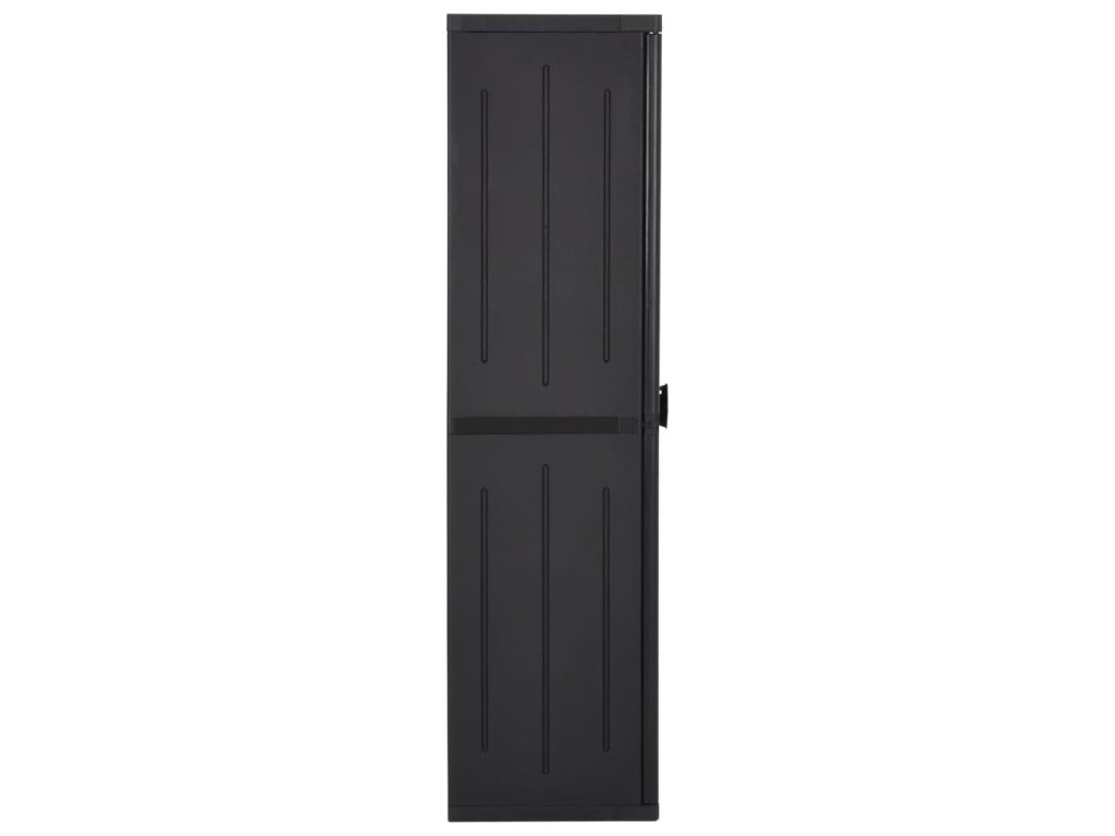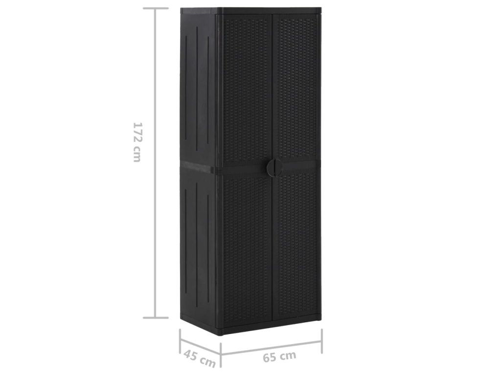 Tento úložný box je vyrobený ze 100% PP (polypropylenu), takže je odolný a snadno se čistí. Jeho 4 police a držák na košťata poskytují dostatek prostoru pro přehledné uspořádání a ukládání vašich nezbytností, jako jsou utěrky, prací prostředky, kartáče a další. Všestranná skříň splní například na terase všechny vaše požadavky.