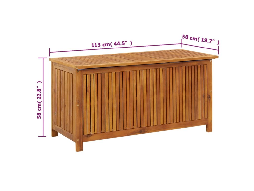 Lavice na terasu je vyrobená z masivního akáciového dřeva, tvrdého dřeva s hustou kresbou. Tento nádherně navržený zahradní box je stabilní, odolný a zaujme na první pohled. Zručné řemeslné zpracování a nádherná kresba dřeva navíc propůjčují každému kusu lehce odlišný charakter. Velký úložný prostor poskytuje dostatek místa pro přehledné ukládání různých předmětů pro domácnost nebo zahradu.