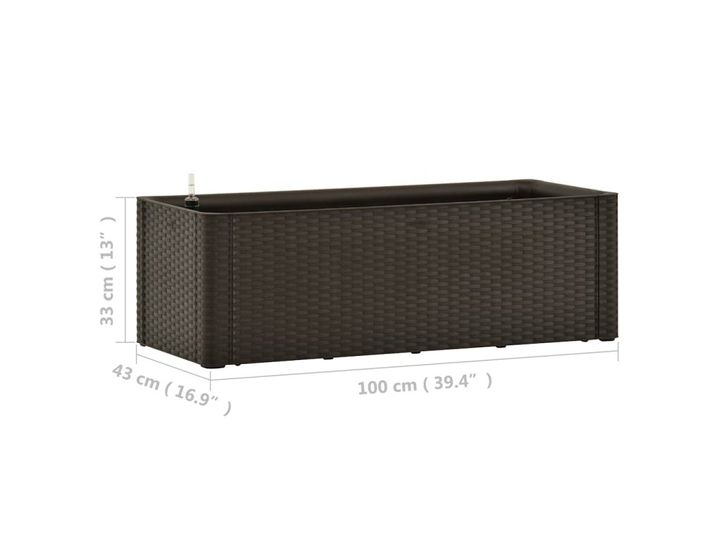 Tento zahradní truhlík je vyrobený z robustního polypropylenu (PP), který je odolný vůči povětrnostním podmínkám, mrazu a UV záření a je vhodný pro vnitřní i venkovní použití. Design připomíná strukturu pravého ratanu. Do tohoto truhlíku se vejde velké množství zelených rostlin a květin. Truhlík je navíc vybavený samozavlažovacím systémem a indikátorem hladiny, který zabraňuje nadměrnému zalévání.