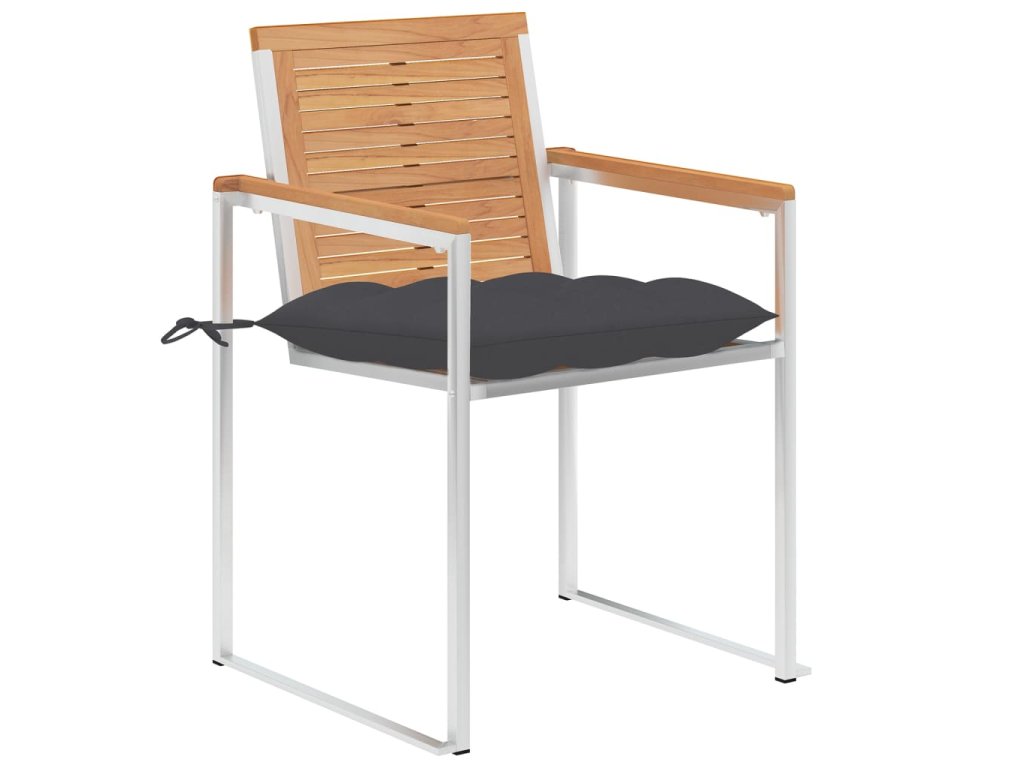 Nábytek je zhotovený z extrémně odolného teakového tvrdého dřeva, které již prošlo procesem smršťování, bylo uměle vysušené a poté jemně a dohladka obroušené. Teakové dřevo je oceňované pro svou výjimečnou pevnost a klimatickou odolnost, a proto je jedním z nejoblíbenějších materiálů pro výrobu zahradního nábytku. Je to skvělá volba, pokud si chcete pořídit venkovní výbavu, která vám vydrží sloužit dlouhá léta. Vzhledem k rámu z vysoce kvalitní nerezové oceli jsou židle zároveň robustní a odolné vůči korozi. Přiložená poduška slouží nejen jako praktický doplněk – plní také dekorativní funkci. Posaďte se a dopřejte si venku skvělou večeři nebo si jen tak odpočiňte a užívejte si počasí s touto klasickou sadou zahradních židlí.