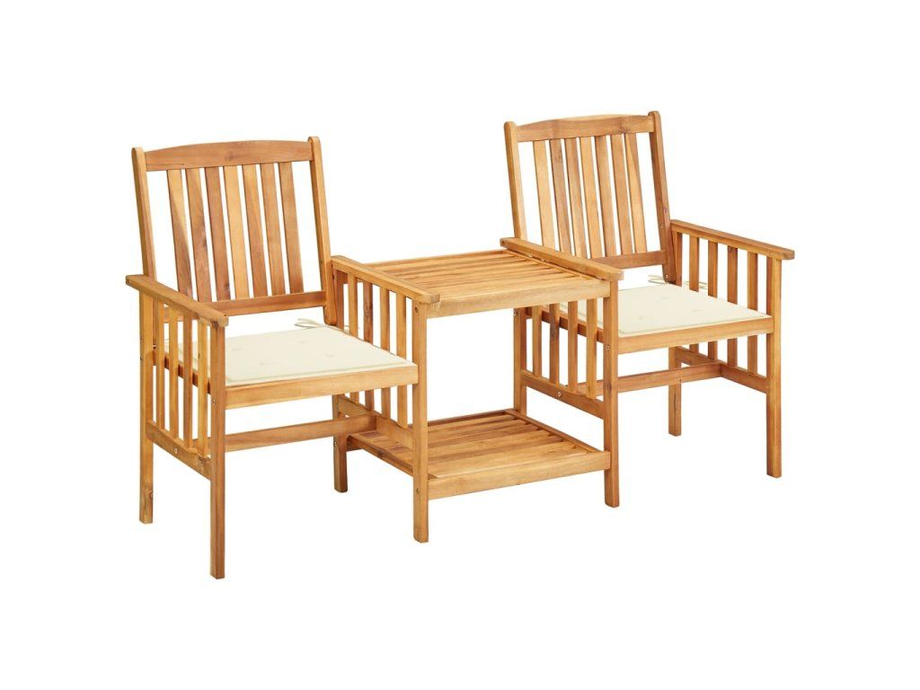 Stůl i židle jsou zhotovené z masivního akáciového dřeva s olejovou povrchovou úpravou, takže jsou mimořádně stabilní a robustní. Odolná stolní deska a spodní polička se skvěle hodí pro odkládání hrníčků, knih a dalších menších předmětů. Opěradla a područky křesílek vám pak zajistí příjemné posezení a relaxaci. Vzhledem k jeho olejovanému povrchu se nábytek navíc snadno čistí vlhkým hadříkem. Podušky dodávají větší pohodlí. Každá poduška je opatřená dvěma páry šňůrek pro pevné uchycení.