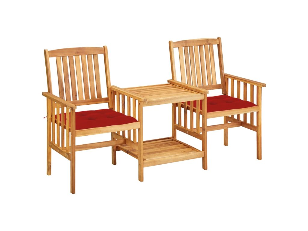 Stůl i židle jsou zhotovené z masivního akáciového dřeva s olejovou povrchovou úpravou, takže jsou mimořádně stabilní a robustní. Odolná stolní deska a spodní polička se skvěle hodí pro odkládání hrníčků, knih a dalších menších předmětů. Opěradla a područky křesílek vám pak zajistí příjemné posezení a relaxaci. Vzhledem k jeho olejovanému povrchu se nábytek navíc snadno čistí vlhkým hadříkem. Podušky dodávají větší pohodlí. Každá poduška je opatřená dvěma páry šňůrek pro pevné uchycení.