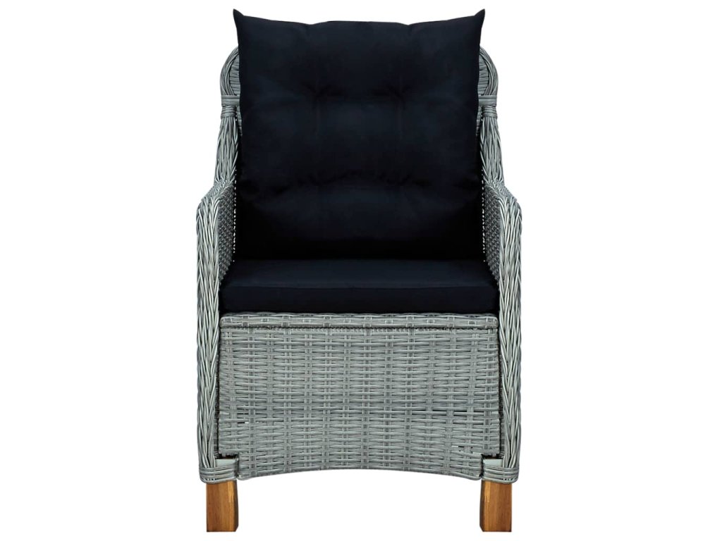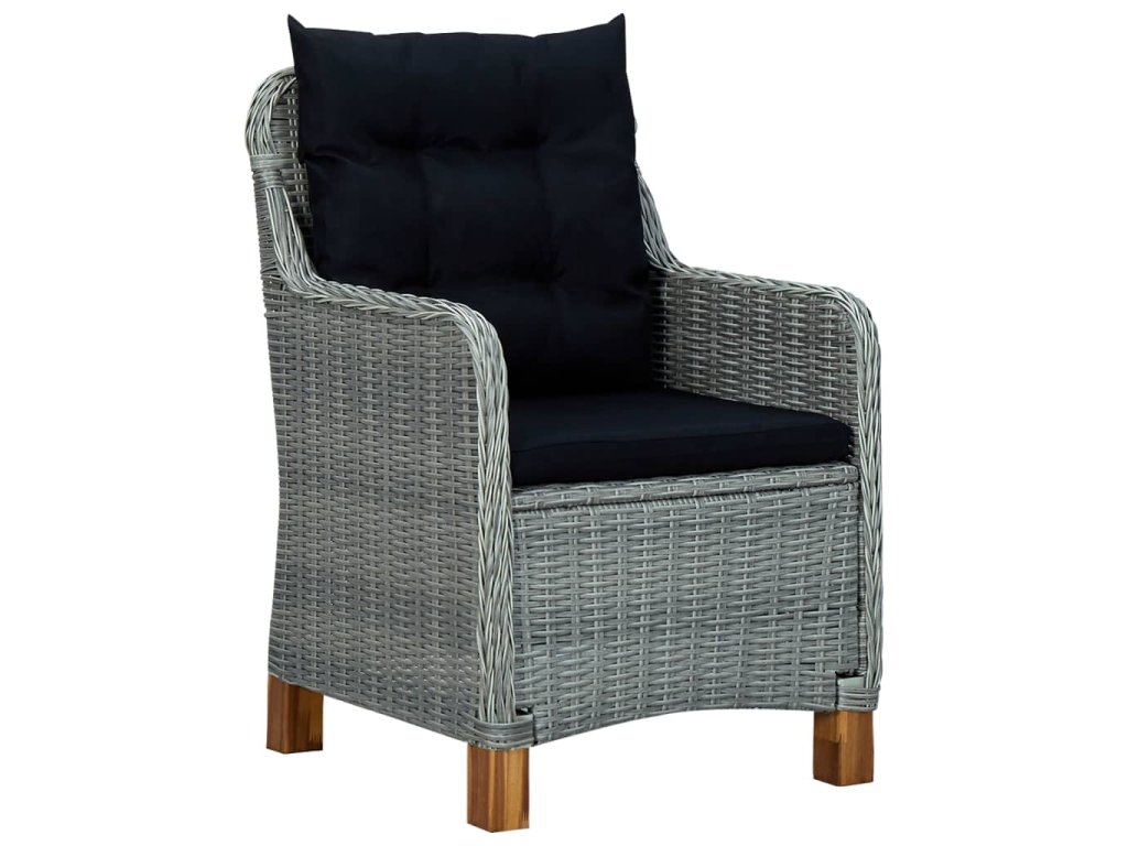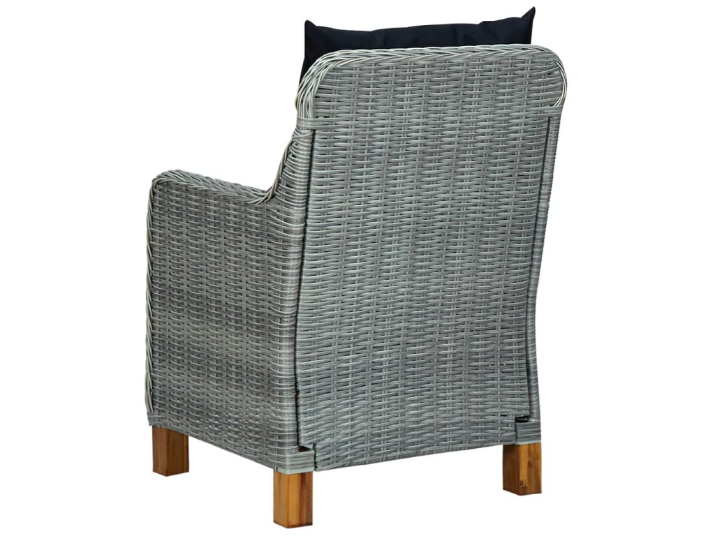 Zahradní židle má práškově lakovaný ocelový rám, potažený kulatým PE ratanem. Je robustní a snadno se čistí. Na silně polstrovaných poduškách na sedák a opěradlo se příjemně a pohodlně odpočívá. Potahy na poduškách mají zip, takže je můžete snadno sejmout a vyprat. Židle mají robustní a stabilní nohy z masivního akáciového dřeva. Jejich konstrukce je lehká, což usnadňuje přenášení židlí.