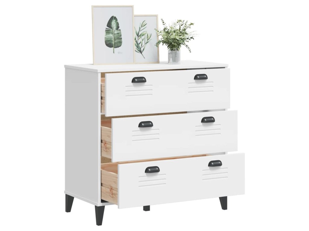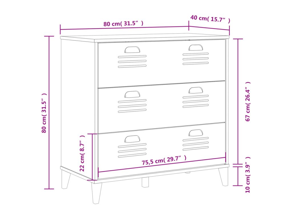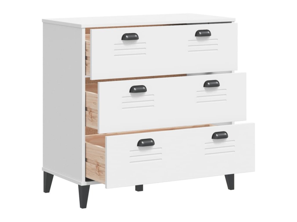 - Masivní borové dřevo: Masivní borové dřevo je krásný přírodní materiál. Borové dřevo má rovnou kresbu a obsahuje suky, které materiálu dodávají jeho charakteristický, rustikální vzhled. Komoda je vyrobena z masivního borového dřeva a je odolná a robustní.