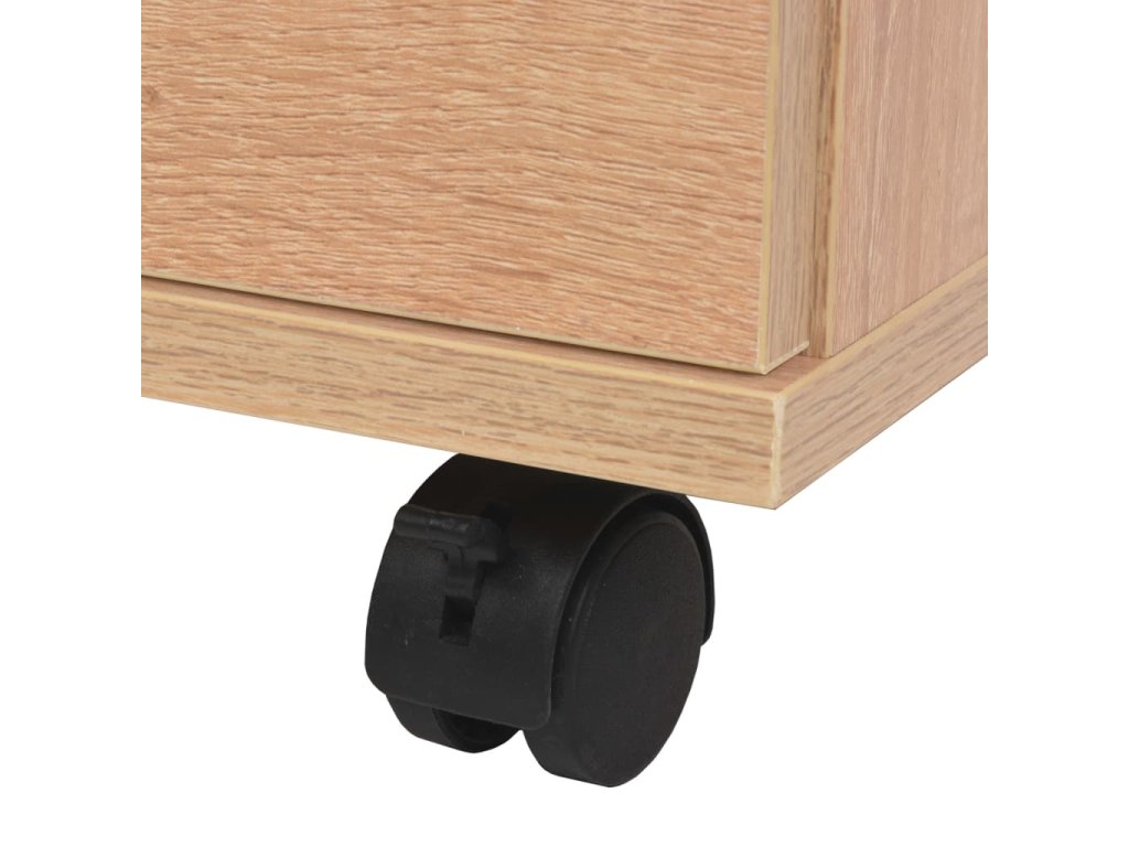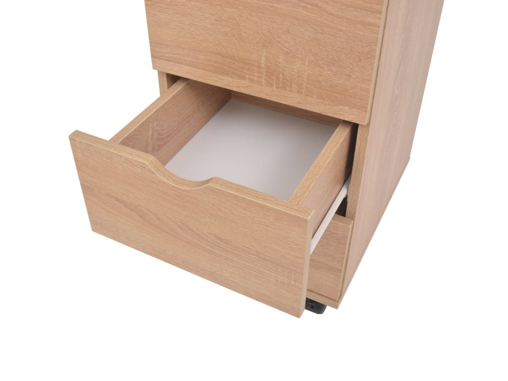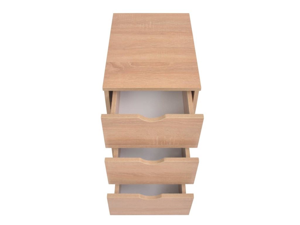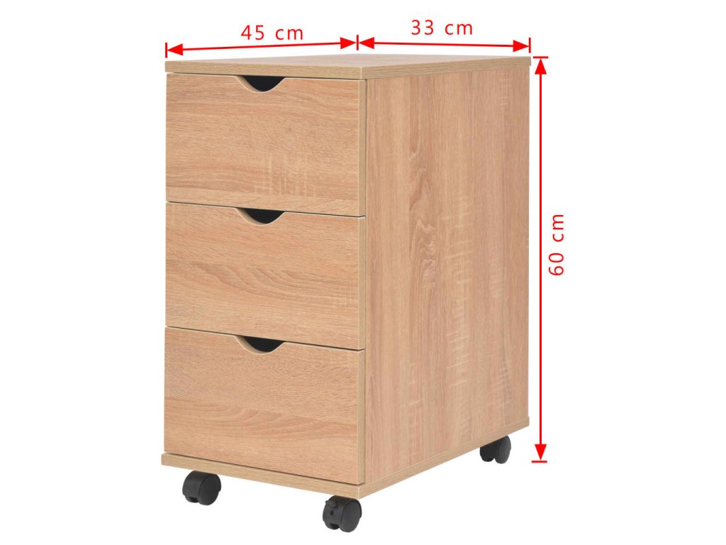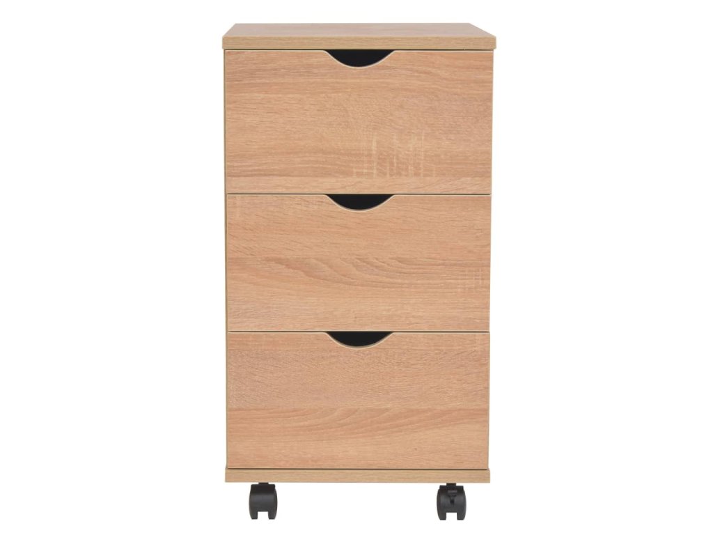 Skříňku tvoří rám z kompozitního dřeva s plastovými kolečky, takže je stabilní a odolná. Tři zásuvky poskytují dostatek úložného prostoru pro úhledné uspořádání různých předmětů, kde je budete mít na dosah ruky. Pomocí koleček lze skříňku snadno a pohodlně přesouvat.
