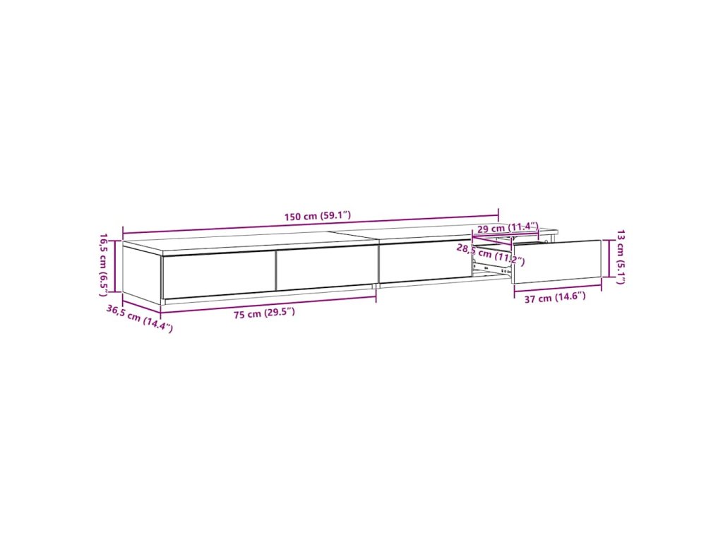- Celkové rozměry: 150 x 36,5 x 16,5 cm (D x Š x V)