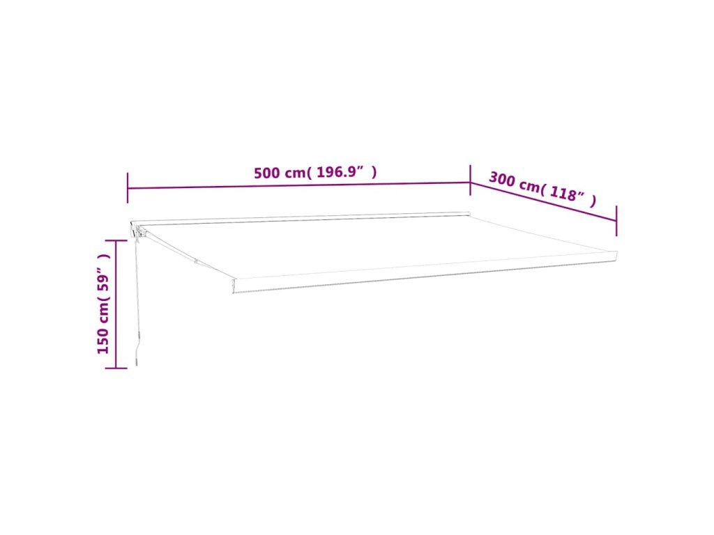 Před montáží a použitím výrobku je třeba si přečíst návod k obsluze. Tento návod si uschovejte pro budoucí použití. Tento výrobek je určen pouze pro venkovní a domácí použití jako ochrana před sluncem nebo dekorace. Nikdy jej nepoužívejte k jiným účelům ani výrobek neupravujte. Nepoužívejte jej na místech, kde dochází k vibracím, impulzům neob vysokým teplotám, například na stěnách v blízkosti pecí. Při montáži a nastavování markýzy vždy používejte vhodné osobní ochranné pomůcky. Při práci ve velkých výškách hrozí nebezpečí pádu, používejte vhodnou ochranu proti pádu. Při montáži buďte opatrní, může hrozit nebezpečí rozdrcení nebo useknutí. NEODSTRAŇUJTE bezpečnostní fólie. Tyto fólie lze odstranit až po dokončení všech montážních kroků, po upevnění všech šroubů a po připevnění výrobku ke stěně. Při předčasném odstranění fólie může dojít k vážnému zranění. Tento výrobek a jeho upevňovací díly jsou vhodné pouze pro instalaci na hladkou cementovou zeď nebo stabilní neomítnuté zdivo. Pokud stěna/zdivo vykazuje trhliny, je třeba se poradit s odborníkem. Pokud má vaše budova vnější plášť (např. izolaci, dvojitou cihlovou stěnu nebo cihlový obklad), měl by instalaci provést odborník. Nikdy neinstalujte na vysokých a větrných místech, protože by sluneční clona mohla spadnout a zranit osoby. Markýzu neinstalujte, pokud zjistíte, že jsou některé díly poškozené nebo zcela chybí. Vnější žaluzie se musí stáhnout v případě, že je rychlost větru vyšší než 28 km/h. Před otevřením markýzy se ujistěte, že jsou všechny držáky bezpečně připevněny ke stěnovým hmoždinkám a všechny šrouby jsou řádně dotaženy. VŽDY markýzu zavírejte při silném nebo prudkém větru, dešti a v době, kdy ji nepoužíváte. V opačném případě může dojít ke zranění osob a/nebo poškození majetku. Také výsuvná ramena jsou pod vysokým napětím a mohou způsobit vážné poškození nebo zranění. Děti by měly být pod dohledem, aby se zajistilo, že si se zařízením nebudou hrát. Nepoužívejte jej, pokud je nutná oprava nebo seřízení. Nepoužívejte markýzu, pokud se v její blízkosti provádí údržba, například mytí oken. Provoz v mrazivých podmínkách může markýzu poškodit. Nepokládejte na rám těžké věci, protože by mohly spadnout a způsobit poškození. Příliš pevné a příliš volné upevňovací prvky by mohly způsobit poškození výrobku nebo být nebezpečné pro osoby. Upozornění: Tkanina by se během provozu neměla prověšovat, jinak se na ní bude hromadit voda. Tkaninu nerozbalujte a neperte. Pokud potřebujete látku vyměnit, obraťte se s žádostí o pomoc na odborníky. Při ovládání ručního spouštění se zataženou vnější roletou buďte opatrní, protože může dojít k jejímu rychlému pádu v důsledku slabých nebo poškozených pružin. Nebezpečí! Silná pružina. NEODSTRAŇUJTE toto lano, dokud nedokončíte všechny kroky montáže, všechny šrouby nejsou utažené a předmět není připevněn ke zdi! Varování! Při povolování ramen dbejte opatrnosti, neboť jsou pod mechanickým tlakem! Náhlé uvolnění skládacího ramene může způsobit zranění. Varování: Před použitím výrobku si pečlivě přečtěte návod k obsluze. Varování: Používání při teplotách pod bodem mrazu může produkt poškodit. Externí použití v budovách a jiných stavbách.