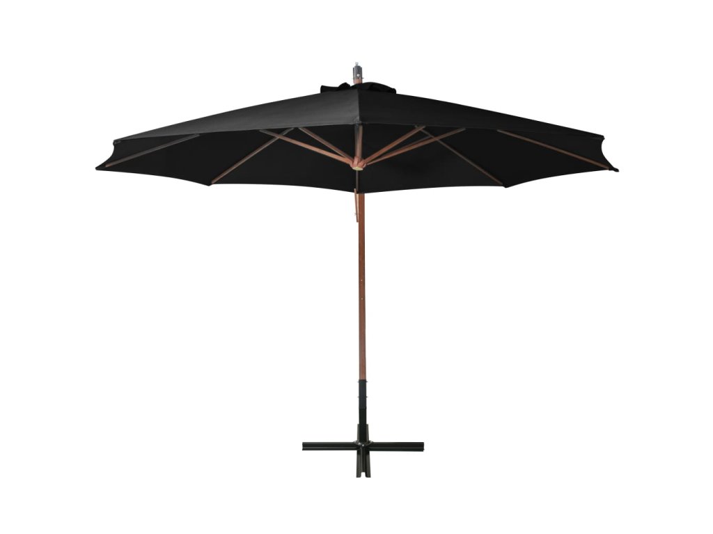Střecha slunečníku je vyrobená z polyesterové tkaniny, která neztrácí barvu a je odolná vůči UV záření, takže zajišťuje optimální ochranu před sluncem. Slunečník má pevnou tyč z masivního jedlového dřeva, 8 odolných bambusových žeber a základnu ve tvaru kříže, je tudíž velmi stabilní. Stříška slunečníku volně visí z tyče, tyč proto nepřekáží v prostoru pod slunečníkem.