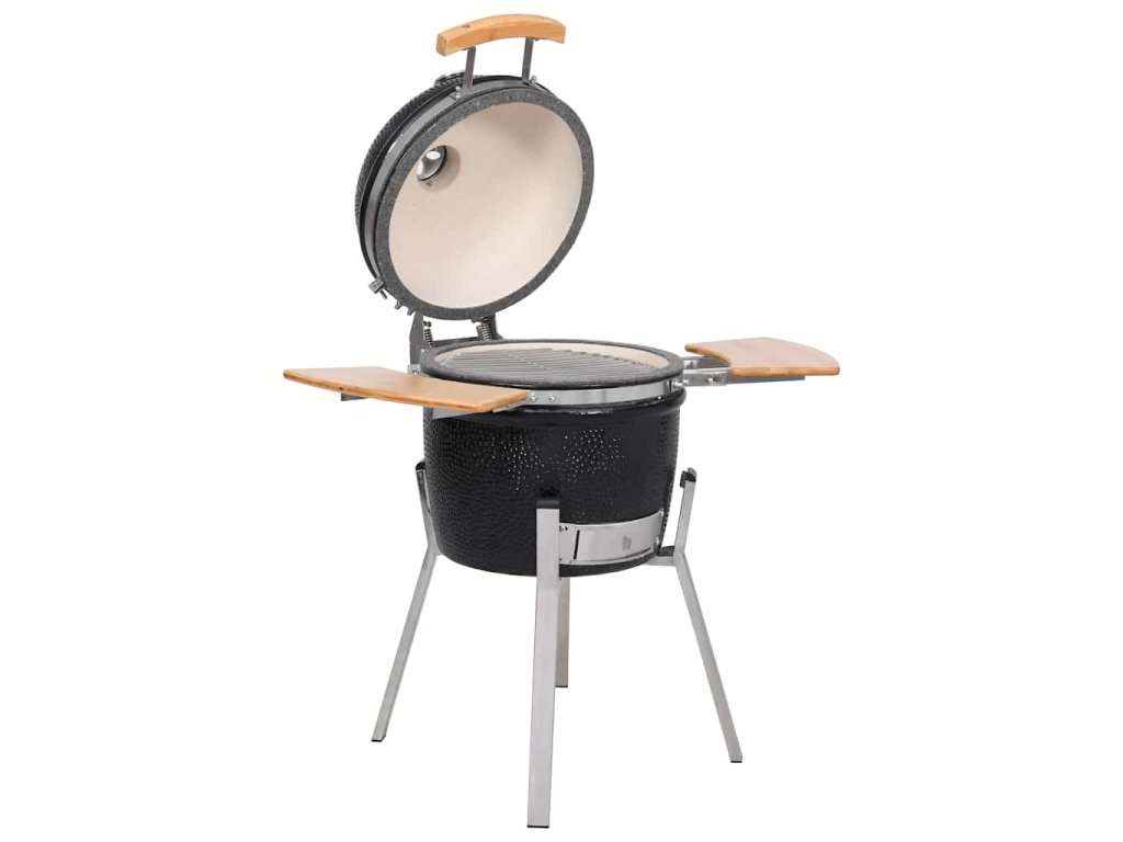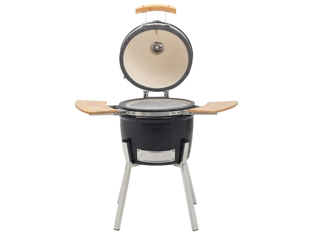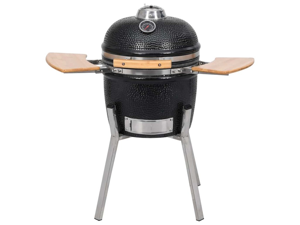 Tento keramický Kamado gril funguje s dřevěným uhlím nebo dřevem a má velkou mřížku s průměrem 27 cm . Nabízí několik funkcí , jako například grilování , pečení , uzení , vaření nebo je vhodný pro udržení jídla v teple . Tento keramický gril má robustní zavesný poklop s otvorem a teploměrem na vrchu . Díky dvouvrstvému průduchu můžete jednoduše ovládat průtok vzduchu a teplotu . Dvě skladatelné boční poličky vám poskytnou prostor pro uložení vašich grilovacích potřeb . Gril je vyroben z velmi kvalitní keramiky a má glazovaný povrch , který dodává grilu ještě větší odolnost . Zároveň je gril krásný i na pohled . Nožičky z nerezové oceli ho dělají extra stabilním . Tento kvalitní gril je vhodný pro přípravu různých druhů jídla , jako například burgery , žebra , ryby , pizza a podobně . Poskytne vám spolu s vašimi přáteli množství zábavy při přípravě jídla .